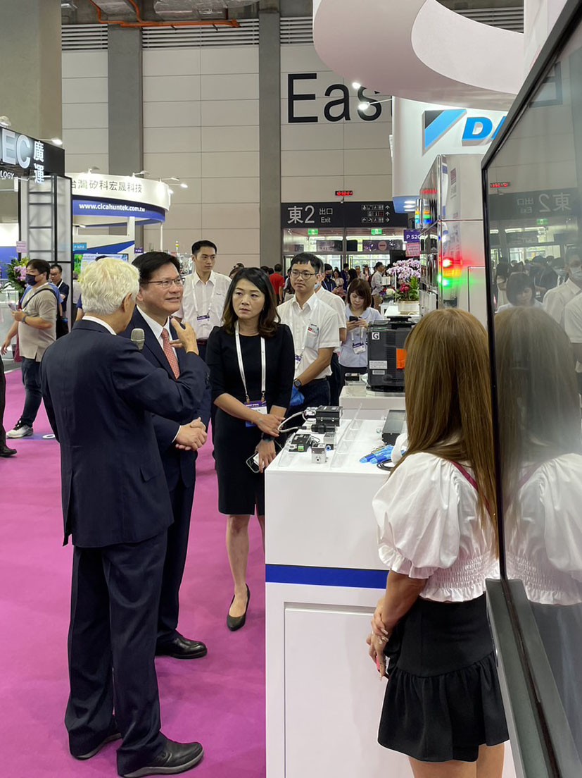 總統府秘書長 林佳龍 (前台中市長 , 交通部長) 也蒞臨台北半導體展 , 陳金柏董事長親自迎接及介紹本次的展出理念及展品。