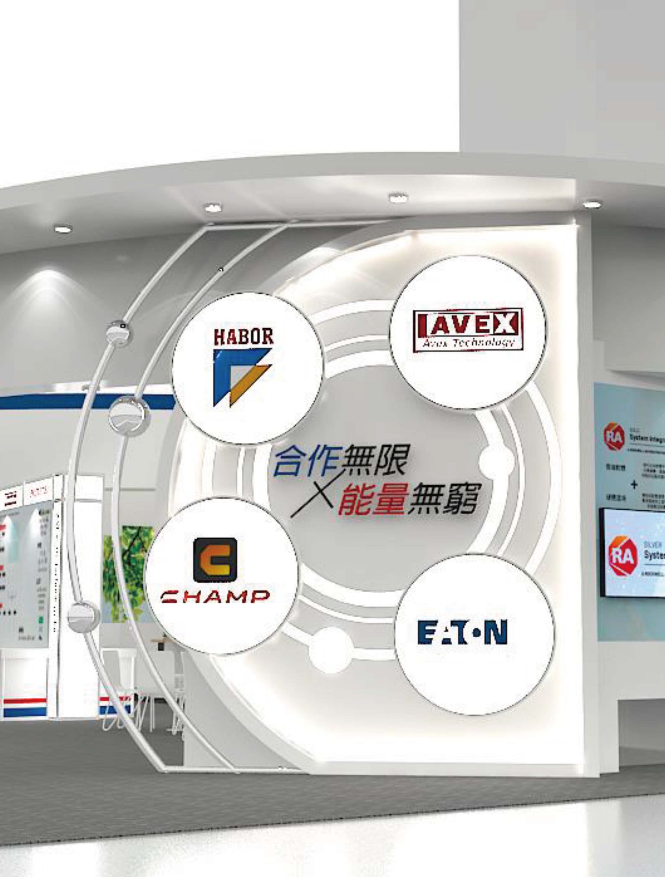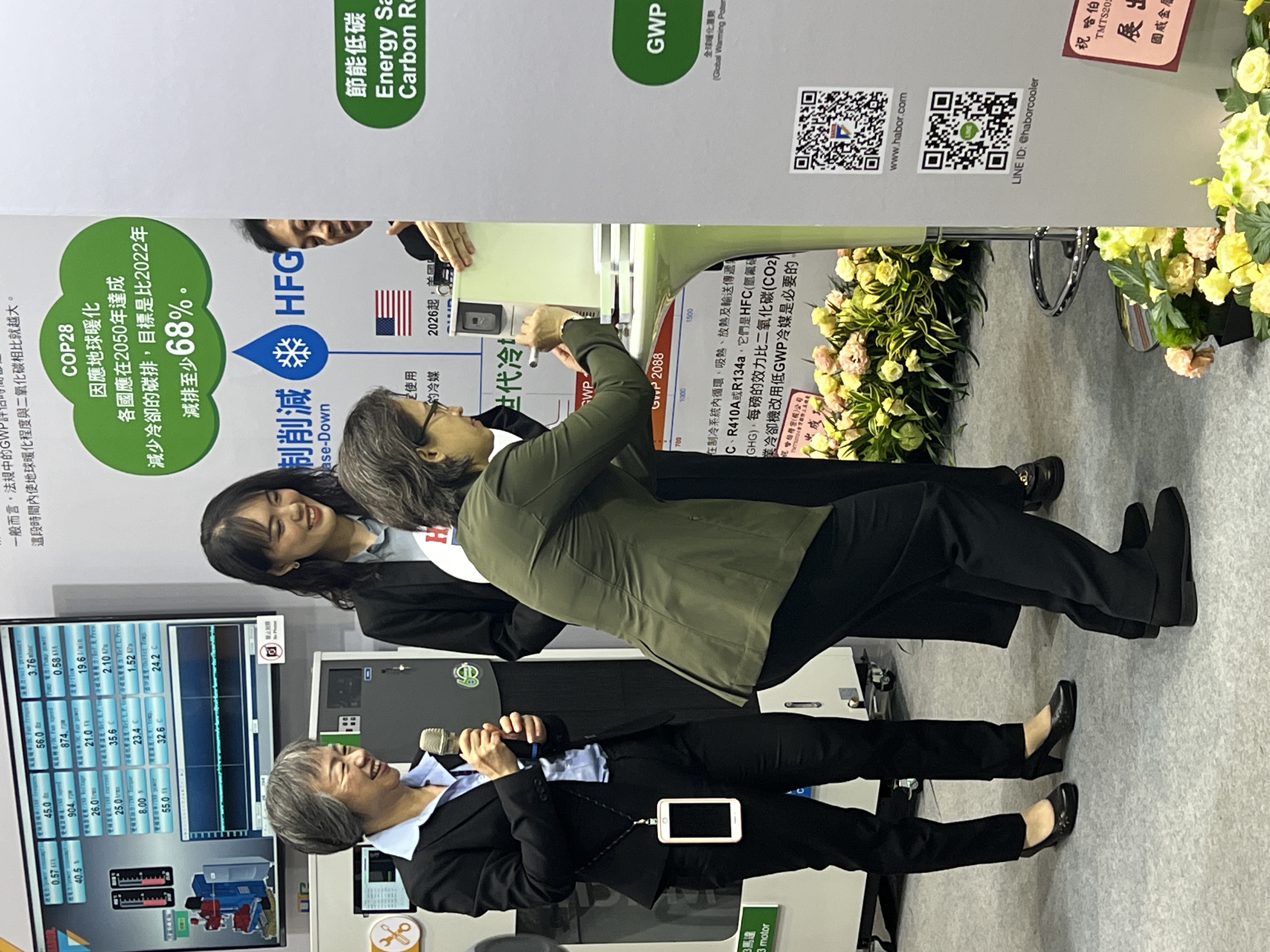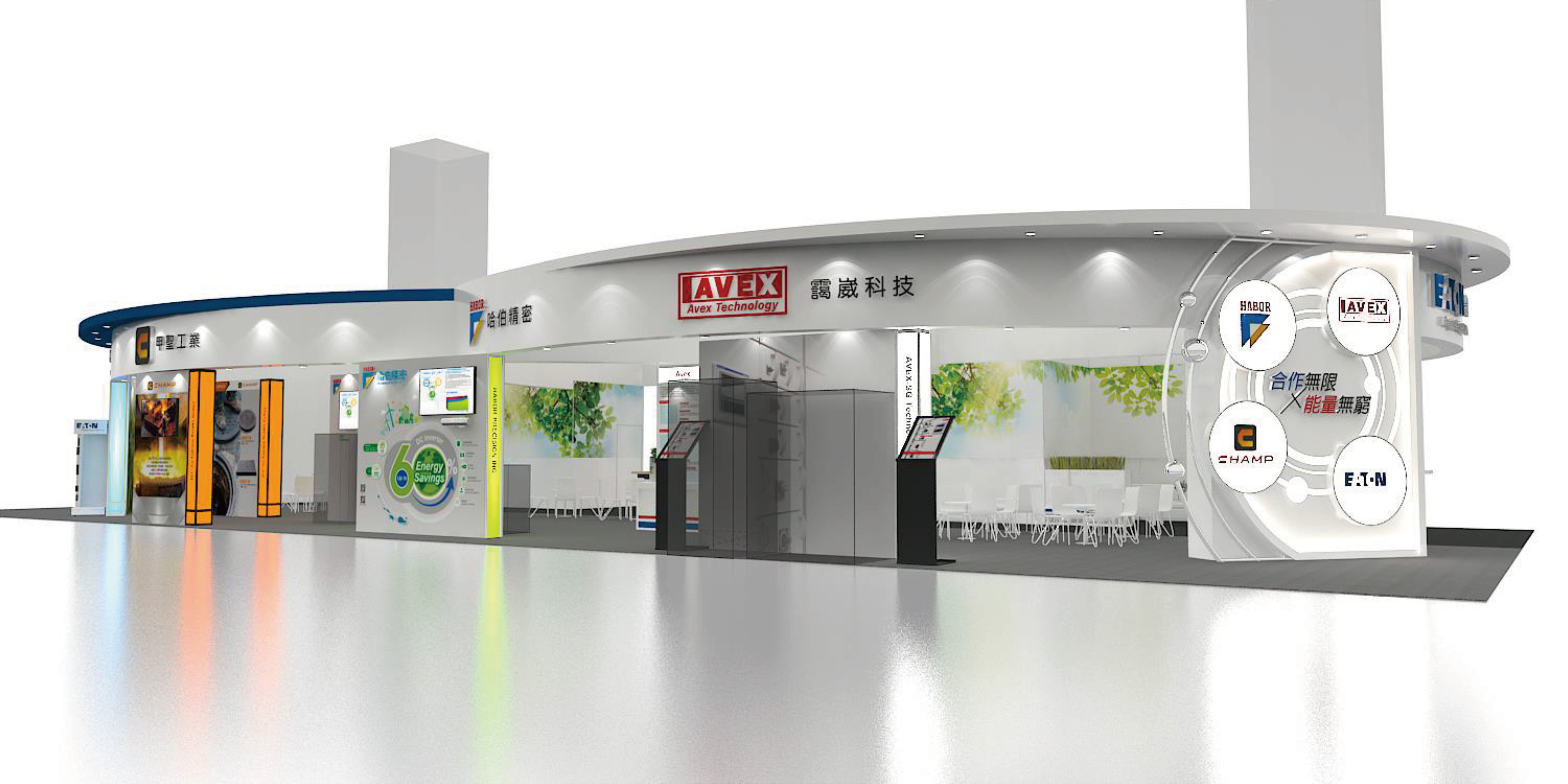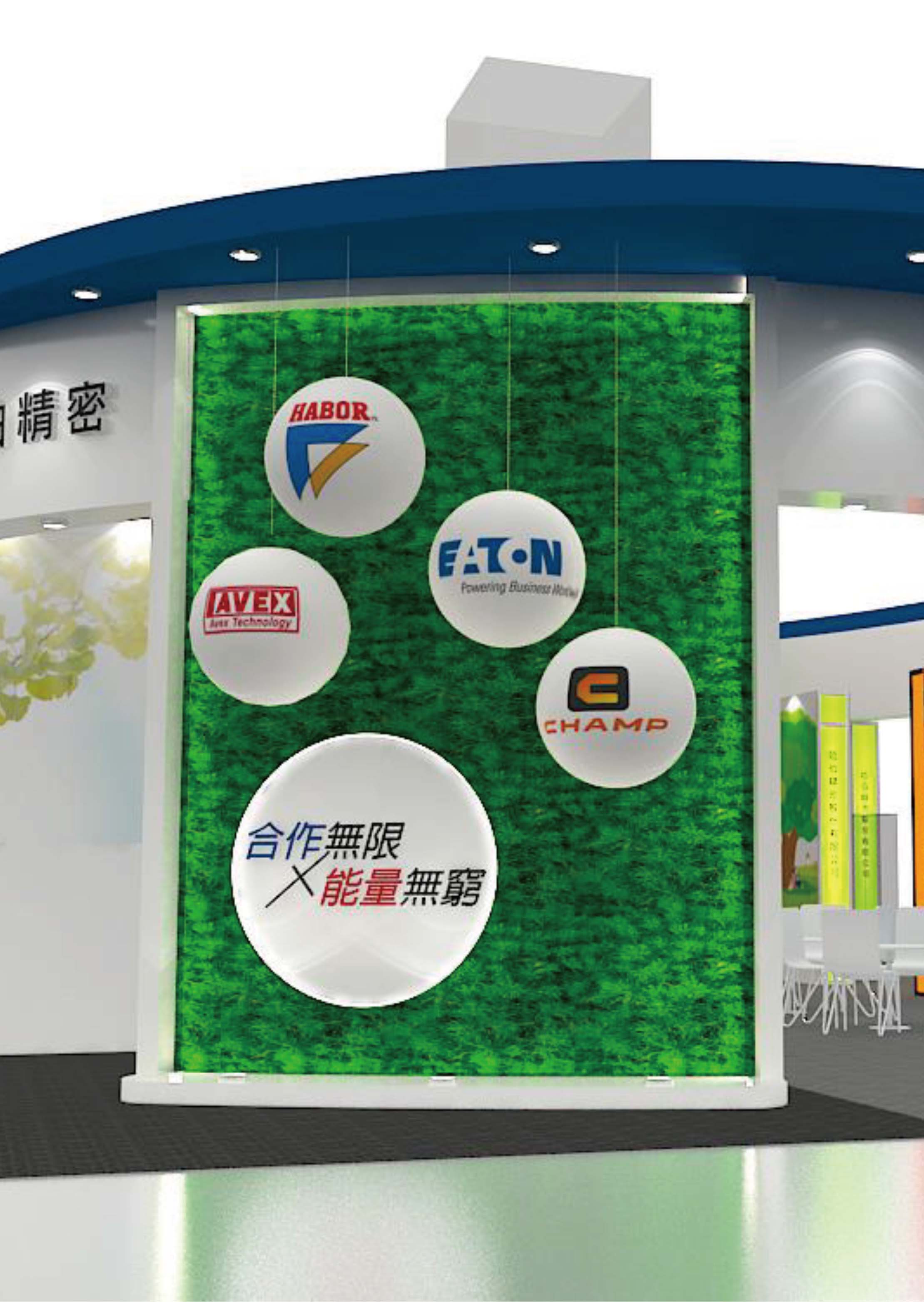攤位設計的兩個形象牆 : 一面強調科技數位 , 一面強調綠色低碳 來呈現。
