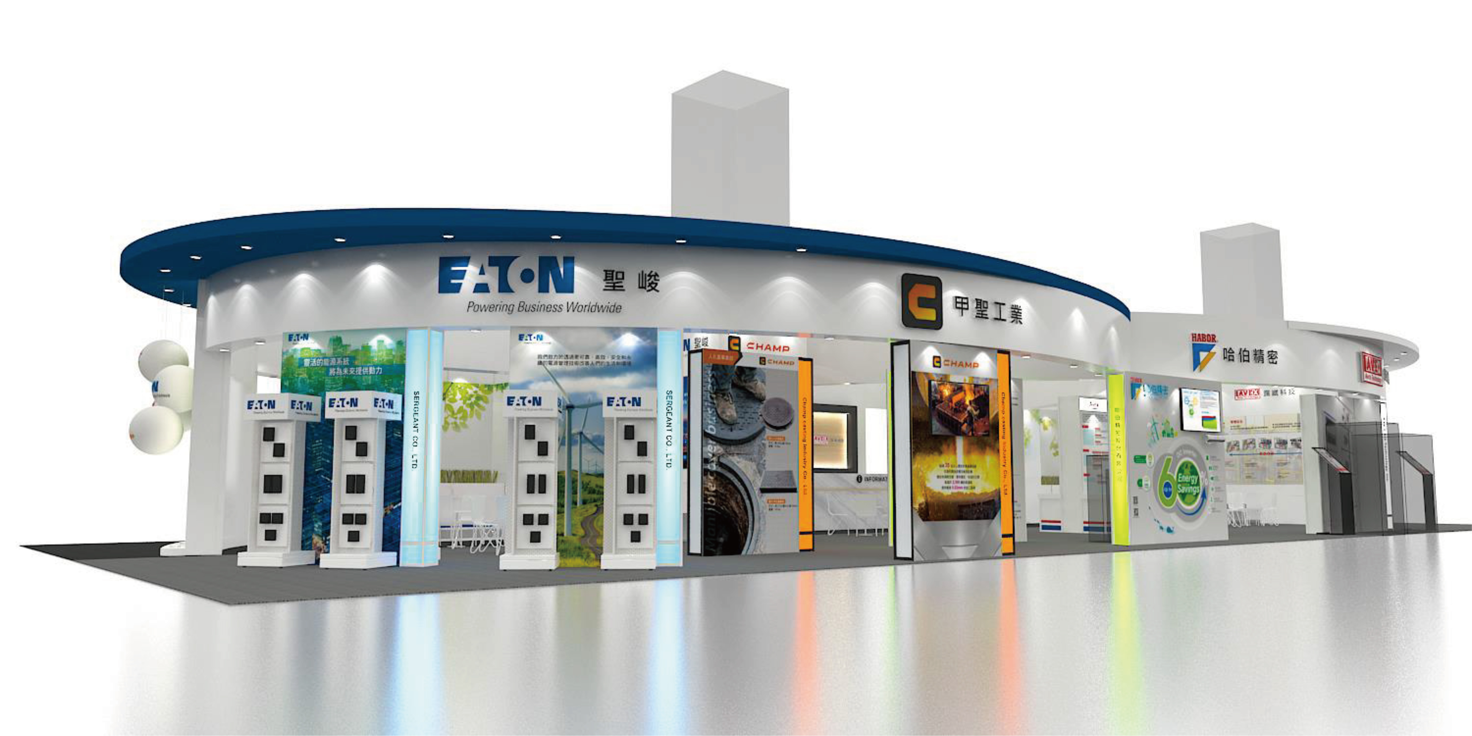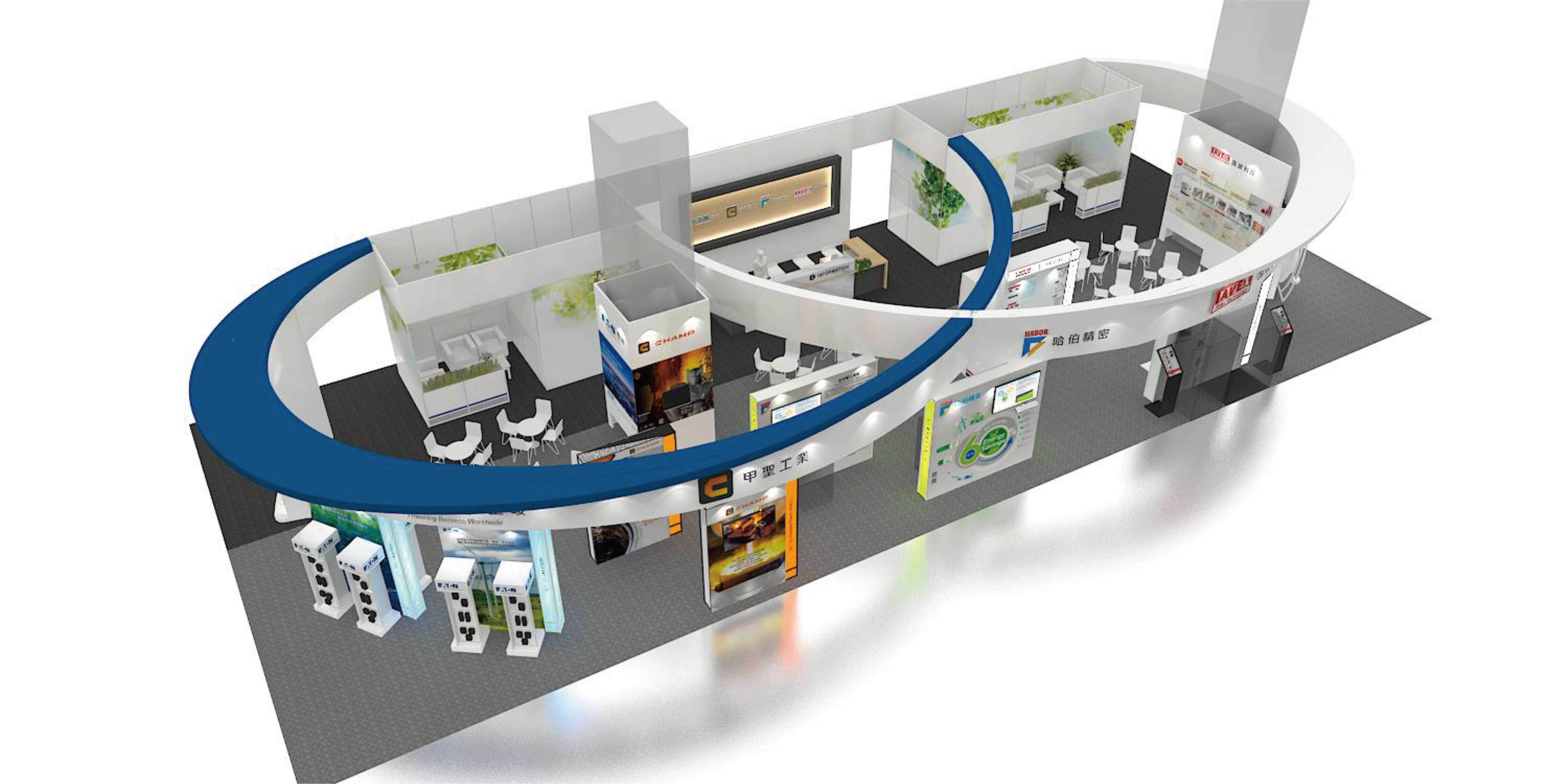 在攤位設計的細節方面,可以考慮加入一些互動元素或者展示特別的創新產品和解決方案,這樣可以吸引更多參觀者並提升他們的參與感。同時,利用宣傳資料和展示板來突出每家公司在數位轉型和綠色轉型方面的成就和特點也是很重要的。
